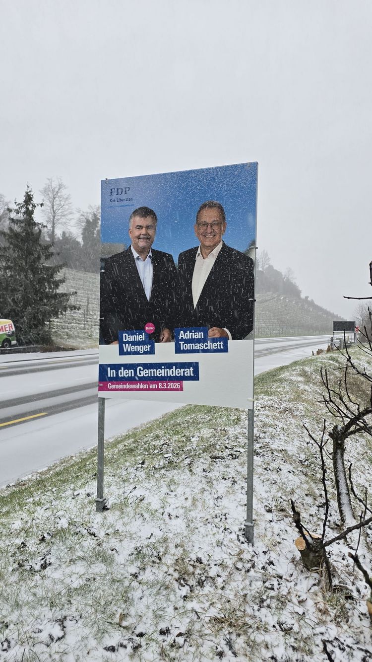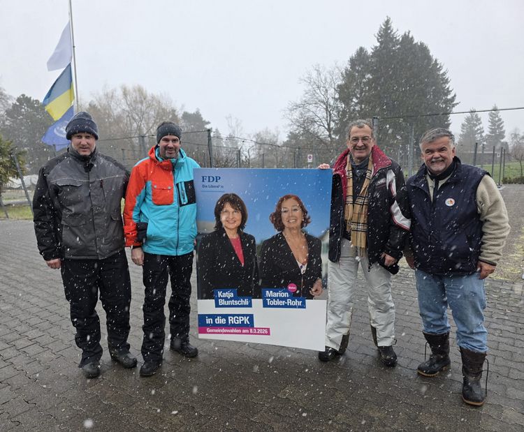 Dick angezogen und voll motiviert: Daniel Wenger, Martin Barciaga, Adrian Tomaschett und Stefan Sulzer beim Aufstellen der FDP-Plakate.
